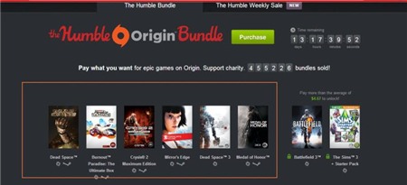 Vâng, đây là một chương trình khuyến mại trên trang Humble Bundle, chỉ với một đô la các bạn sẽ mua được ngay gói non BTA gồm sáu tựa game khủng: Dead Space 1,3, Mirror's Edge, Burnout Paradise, Crysis 2 và Medal of Honnor; còn với 4,75 đô la các bạn sẽ có thêm hai tựa game: Battlefield 3, The Sims™ 3 + starter pack (gói BTA).